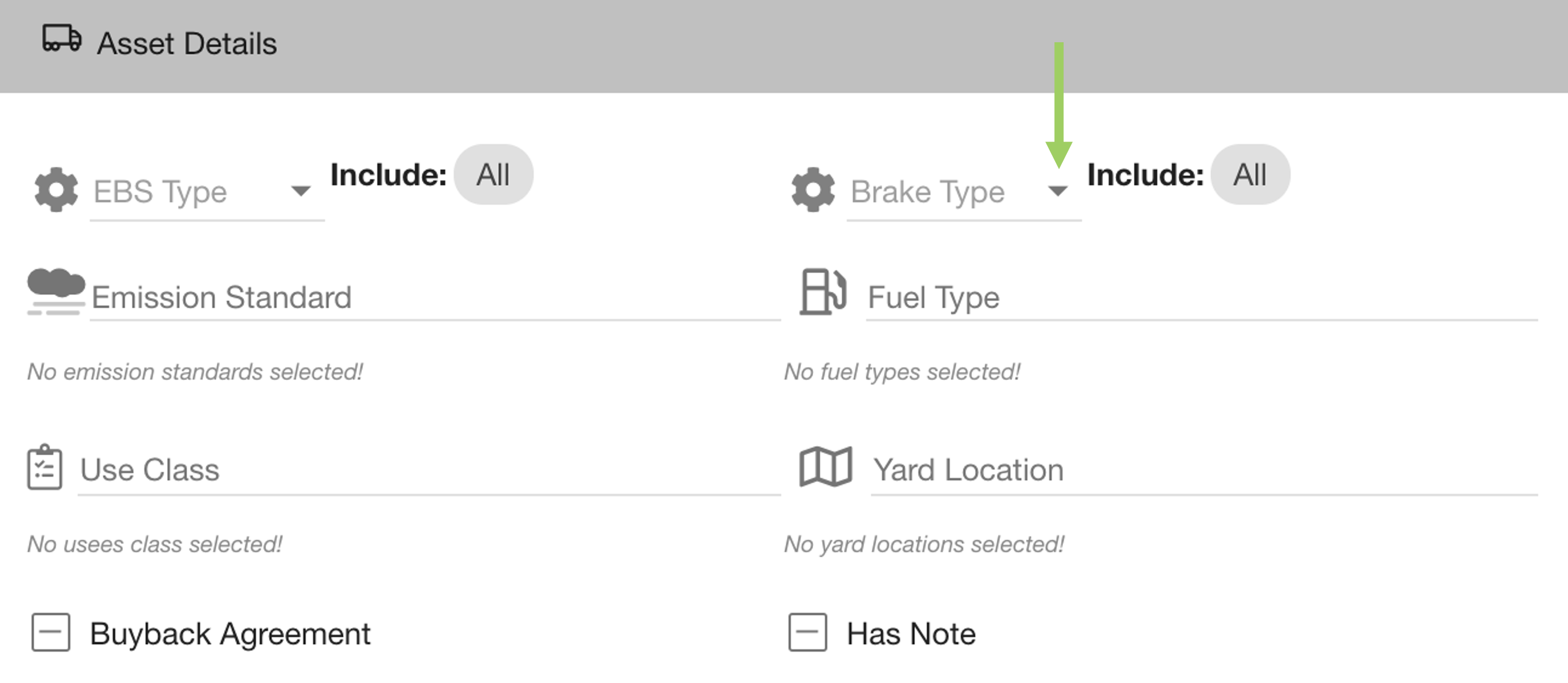 To open the dropdown options click on the placeholder in the field (e.g. ‘Brake Type’).