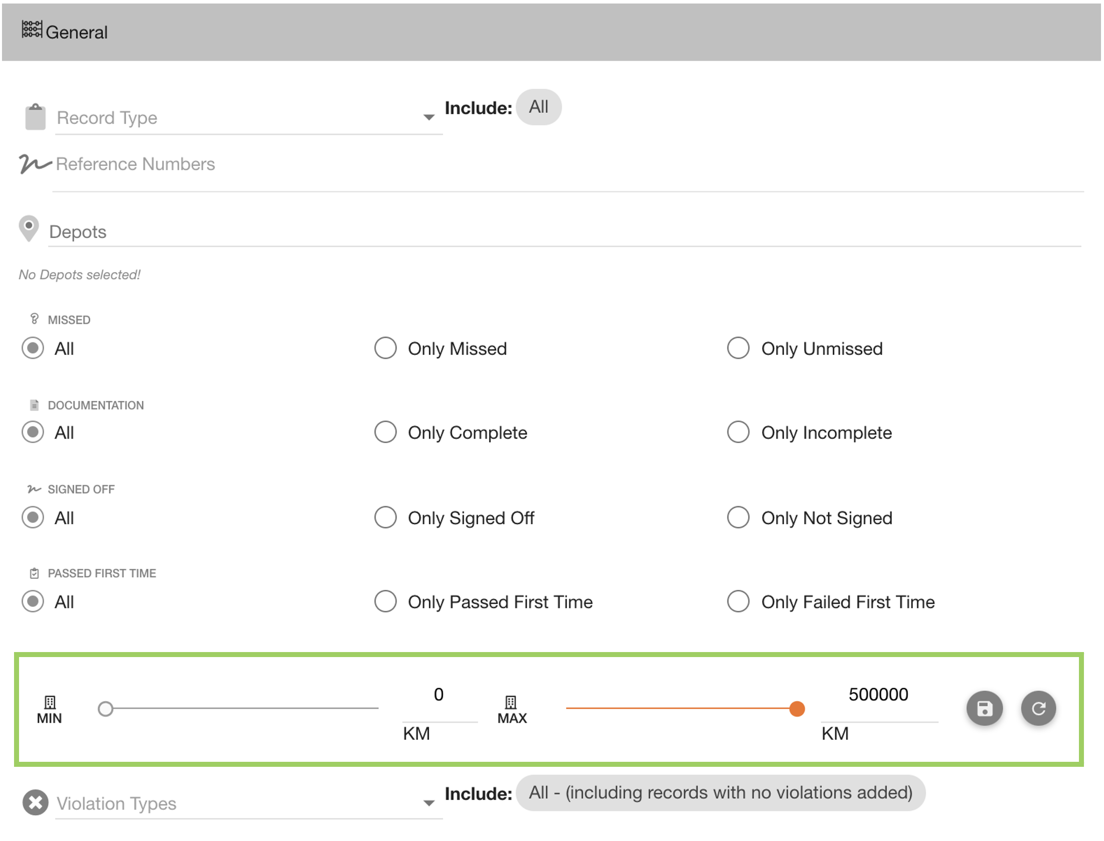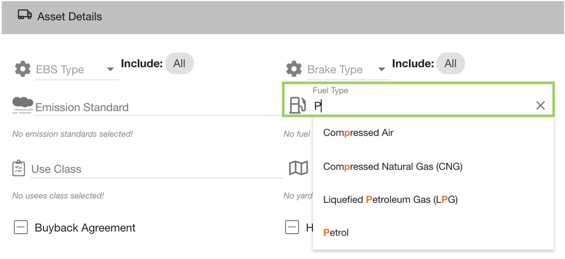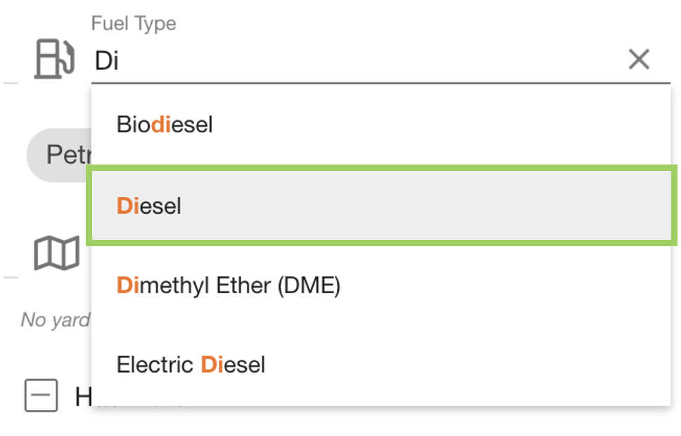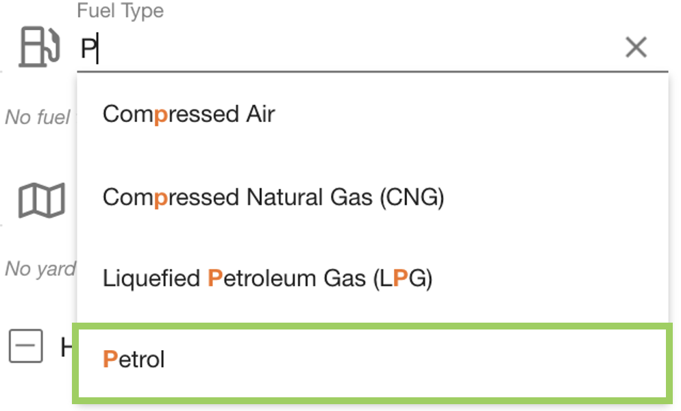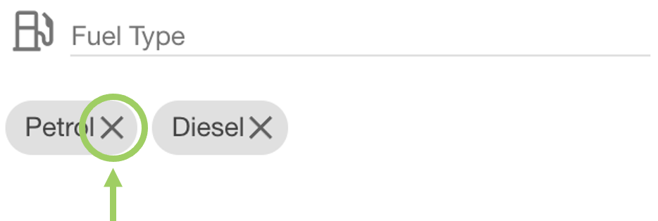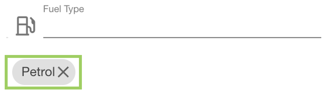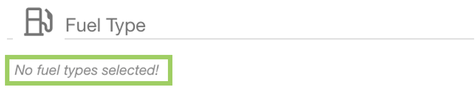 When all options have been removed, the field resets to ‘No fuel types selected’ - which would include all fuel types when filtering the assets.